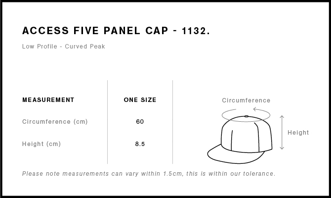 Construction - Low profile - five panel cap, curved peak Adjustable fastener with metal clasp, tonal under-peak lining One size fits all Tear-out AS Colour label