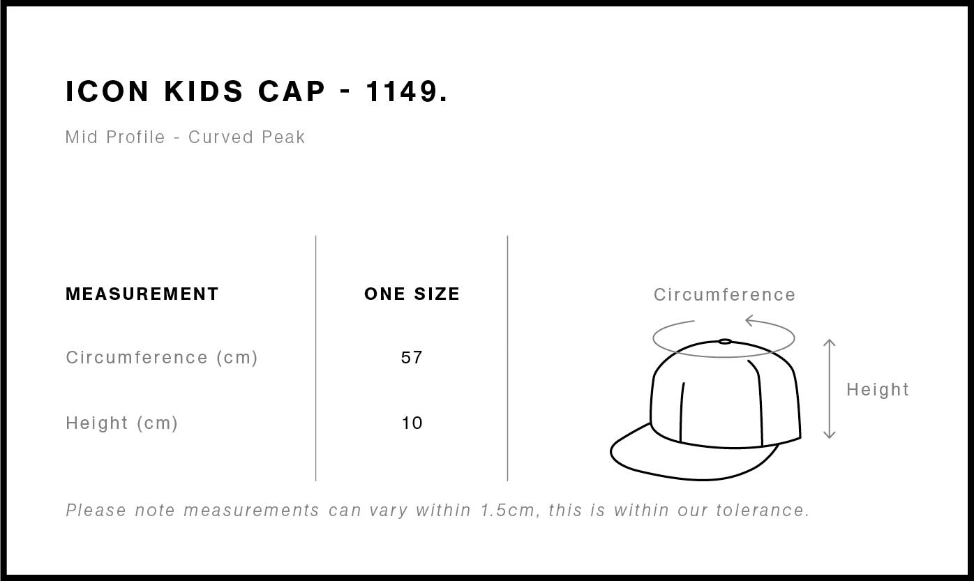 The Icon Kids Cap is a mid-profile, six-panel design with a curved peak. Made from 100% cotton with a stretch strapback, contoured crown, tonal under-peak, and tear-out label.
