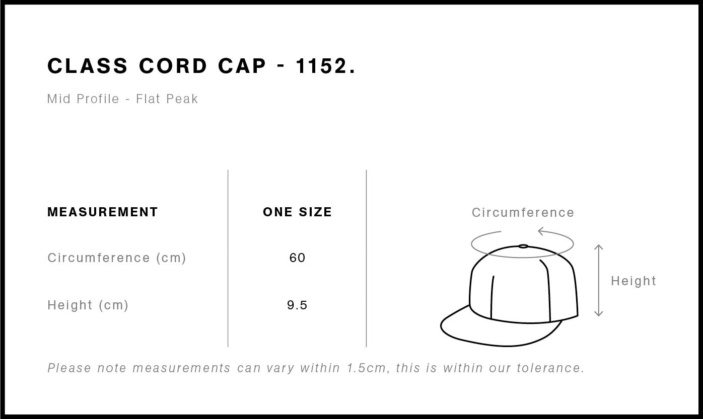 AS Colour Class Cord Cap: A mid-weight, unstructured six-panel cap crafted from 100% cotton with 8-Wale Partridge Cord. Features include a flat peak, adjustable metal clasp fastener, and tonal under-peak lining. One size fits all, complemented by a tear-out AS Colour label for personalised wear.