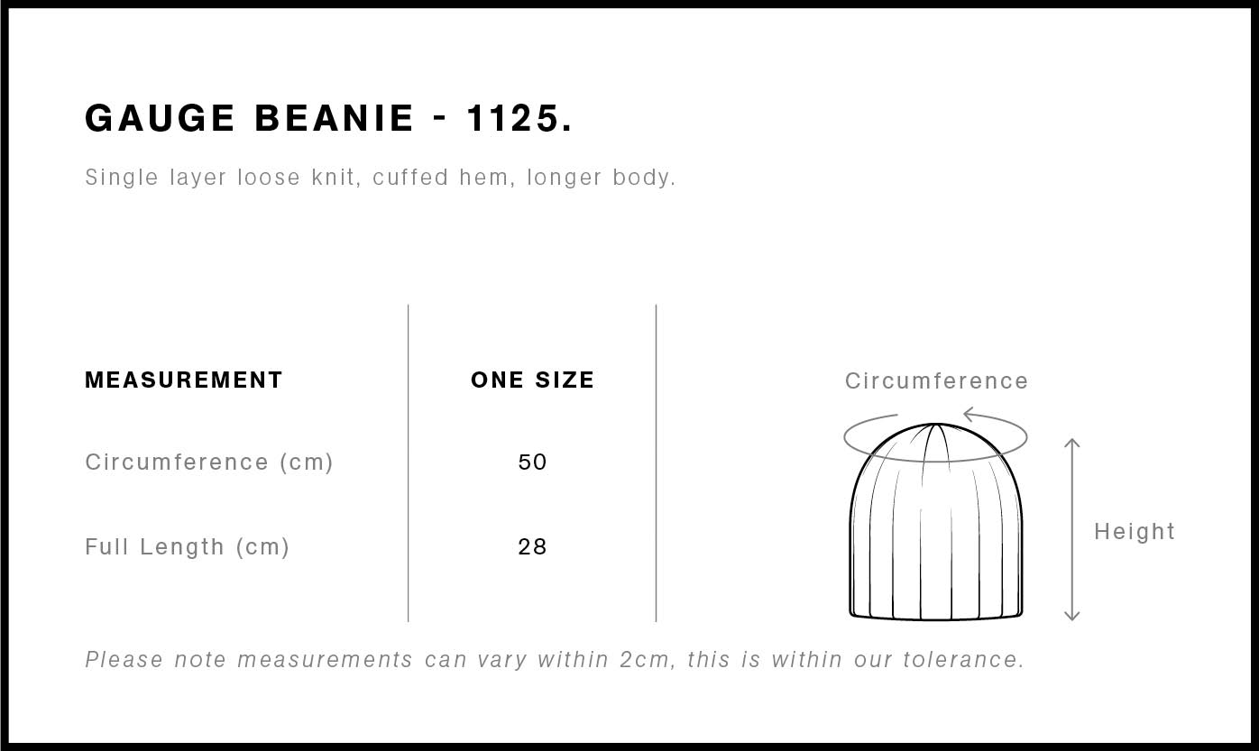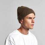 The AS Colour Gauge Beanie, crafted from a heavy-weight blend of 50% recycled wool and 50% recycled acrylic. It features a ribbed knit, cuffed hem, and longer body for warmth. One size fits all.