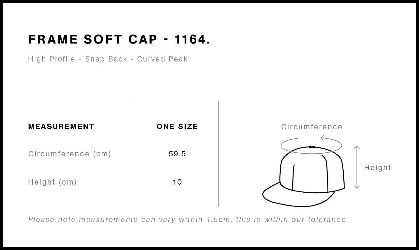 Discover the AS Colour Frame Soft Cap: A high-profile snapback with a curved peak, crafted from mid-weight 100% cotton. Features include an unstructured front for a relaxed fit, plastic adjustable snapback closure, tonal under-peak lining. One size fits all.